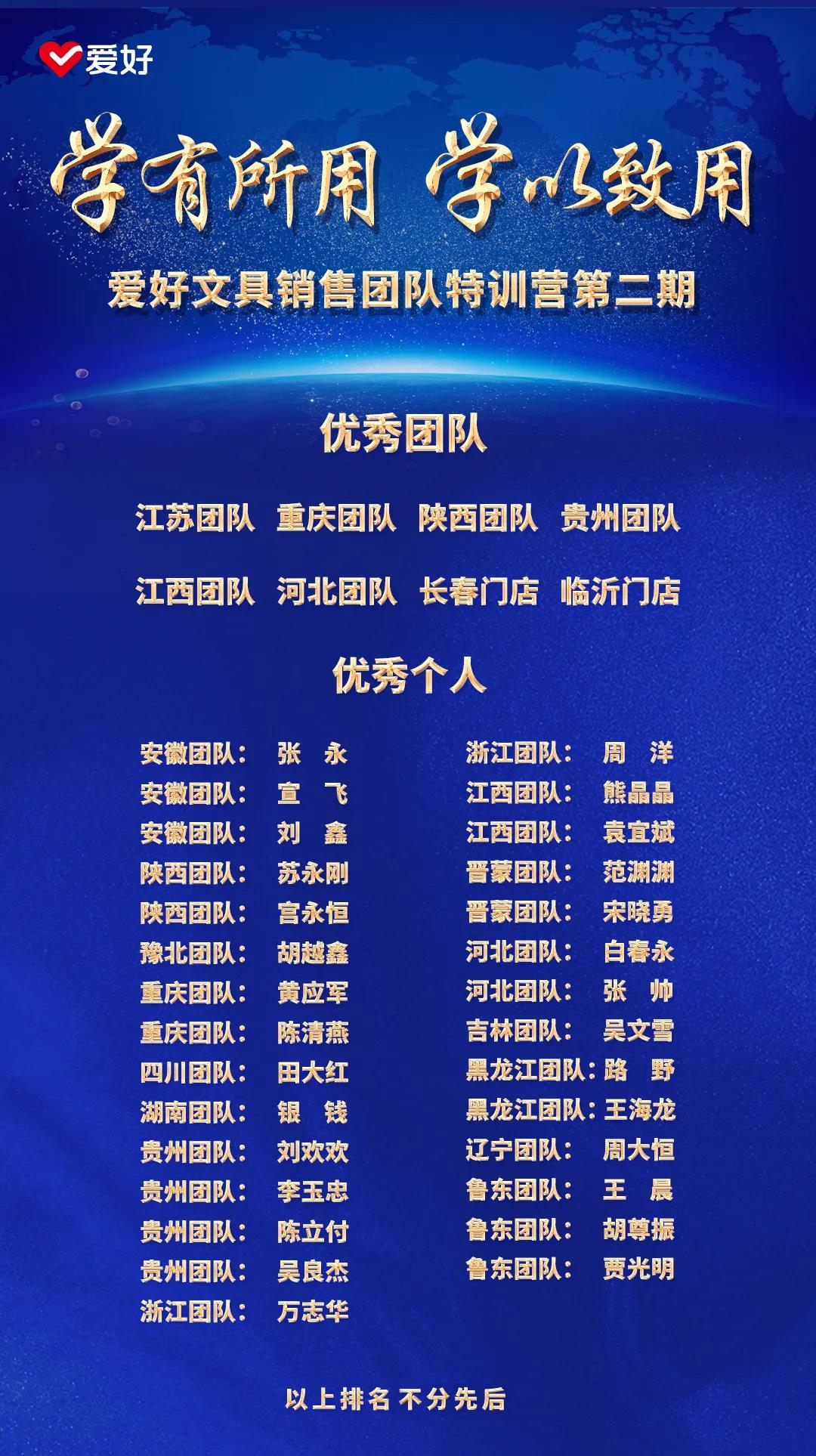 經(jīng)過激烈的比拼,愛好文具銷售團隊特訓營第二期最終評選出8支優(yōu)秀團隊和29名優(yōu)秀個人。